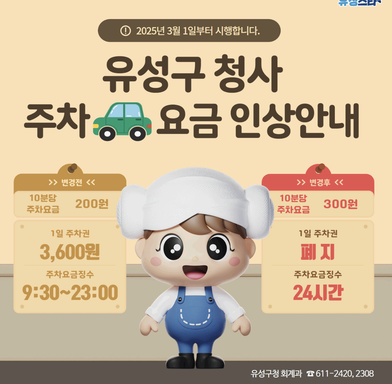 유성구가 민원이용객의 불편 해소를 위해 2025년 3월 1일부터 주차요금을 인상합니다.