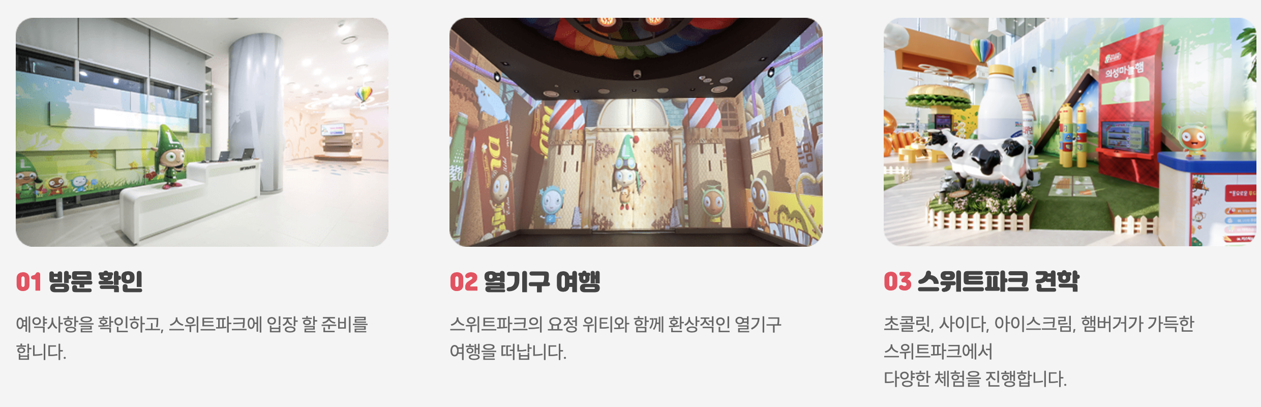 스위트파크(SweetPark)는 롯데어린이식품체험관으로, 우리 아이들이 ‘맛있는 먹거리로 가득한 달콤한 공원’에 여행을 떠날 수 있도록 구성되었습니다.