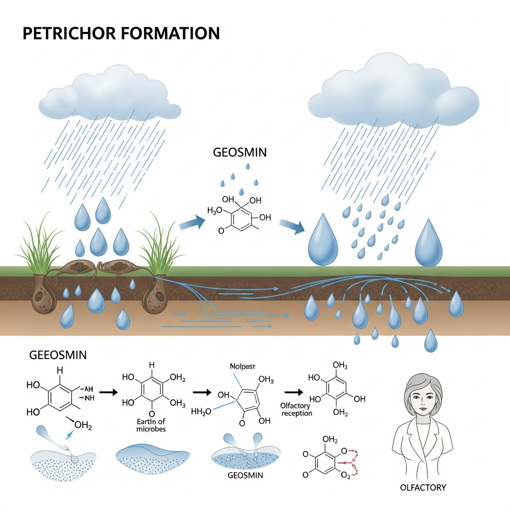 💧물이 떨어질 때 흙 속에 갇혀 있던 게오스민이 **에어로졸(작은 물방울 입자)**로 튀어나오고, 우리가 그걸 후각으로 감지하는 것이죠.