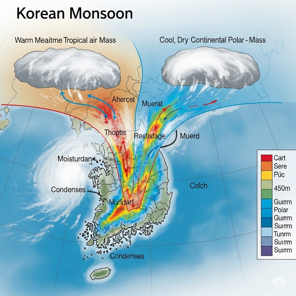 장마는 한반도 상공에서 성질이 다른 두 개의 거대한 공기 덩어리, 즉 **'기단(氣團, air mass)'**이 서로 세력을 다투며 충돌할 때 발생합니다. 이 충돌 지점에서 비가 내리는 **'정체전선(Stationary Front)'**이 형성되고, 이 전선이 한반도에 머무르면서 긴 기간 동안 비를 뿌리게 됩니다.