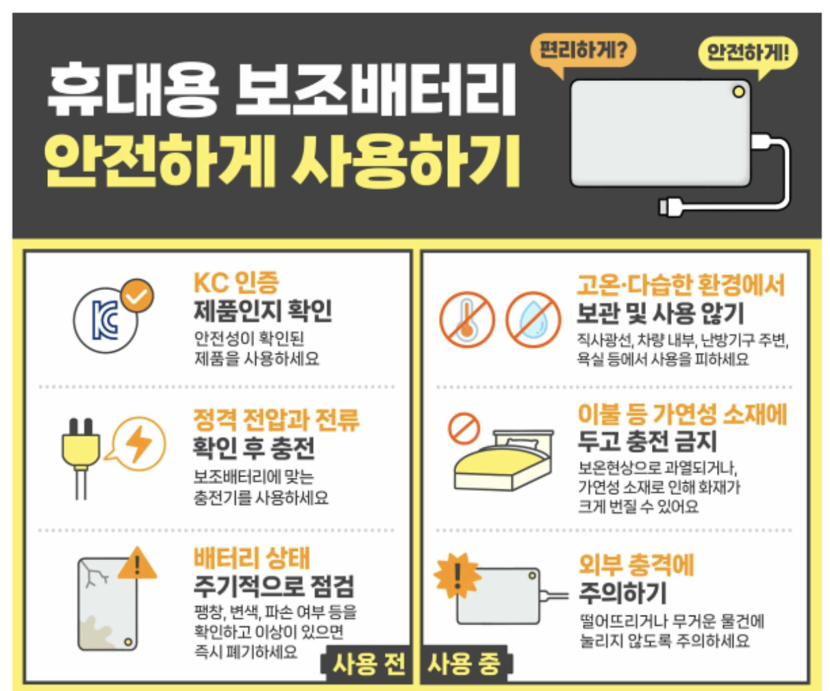 한국소비자원, 산업통상자원부 국가기술표준원, 국립소방연구원은 일상생활의 필수품이 된 휴대용 보조배터리를 안전하게 사용하기 위한 수칙을 홍보함.