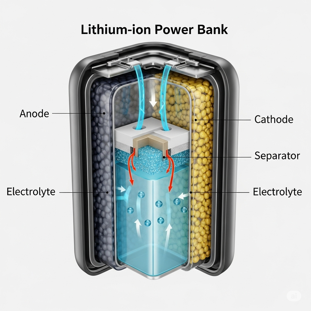 부분의 휴대용 보조배터리는 **리튬 이온 배터리(Lithium-ion Battery)**를 사용합