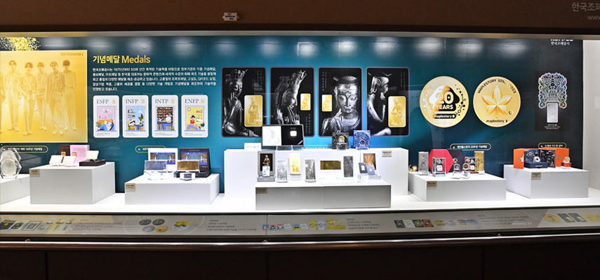 한국조폐공사관에서는 우표와 크리스마스 실, 수표, 어음, 증·채권, 신분증, 여권, 각종 기념메달과 스포츠 대회의 시상메달, 대통령에게 수여되는 무궁화대훈장 등 12종의 훈장과 포장을 살펴 볼 수 있다. 세계 70여개국의 은행권과 주화들도 전시된다. |