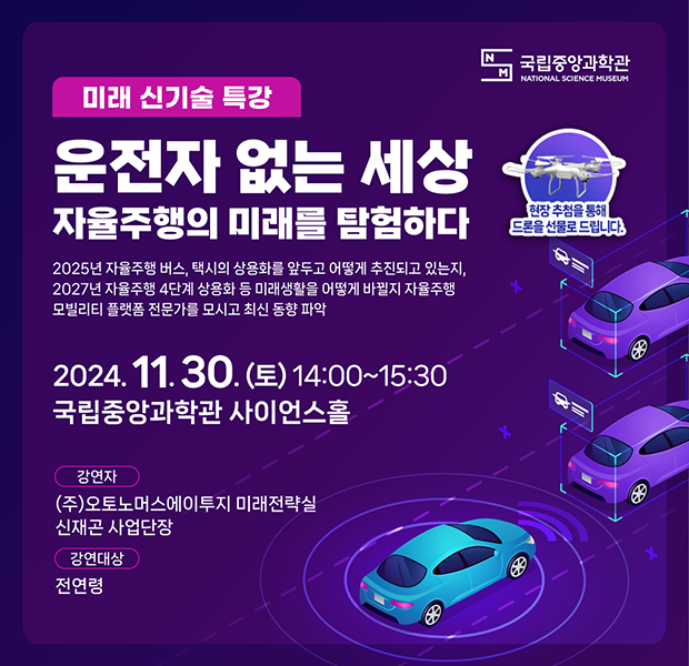 이번 강연에는 미래 자율주행 자동차 사업을 직접 담당하고 있는 연구자와 함께, 세종시에서 운행하고 있는 자율주행 버스에 적용된 자율주행 기술과 현장실증 과정에 숨겨진 다양한 스토리로 재미와 감동을 전달할 예정입니다.