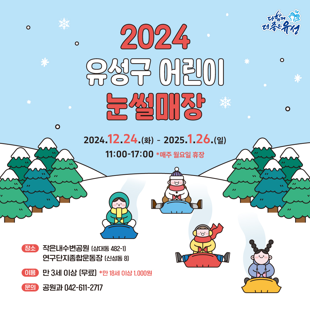 유성구에서 12월 24일(화) ~ 2025년 1월 26일(일)까지 '2024 유성구 어린이 눈썰매장'을 운영합니다.