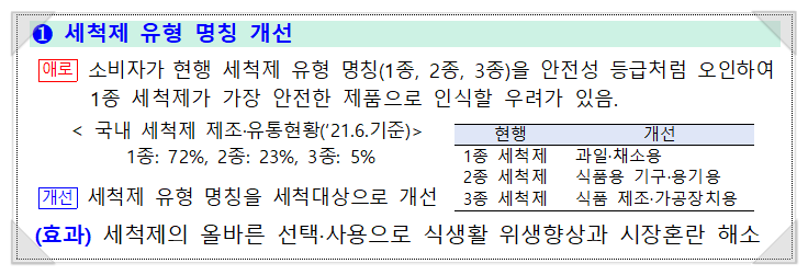 (기존 분류) 1종, 2종, 3종 → (변경 분류법) '과일·채소용' / '식품용 기구·용기용' / '식품 제조·가공장치용 세척제'