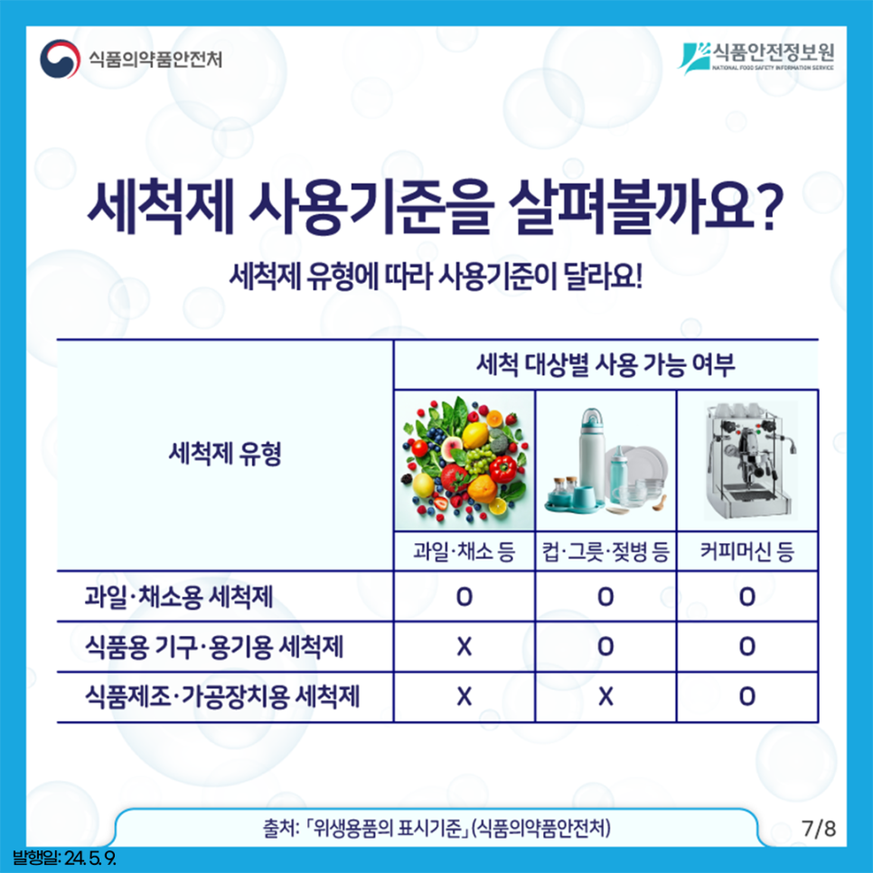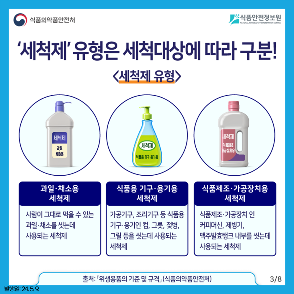 | 식품용 기구·용기용 세척제 | 가공기구, 조리기구 등 식품용 기구·용기인 컵, 그릇, 젖병, 그릴 등을 씻는데 사용되는 세척제 | 컵 그릇 젖병 등, 커피머신 등 사용가능 |