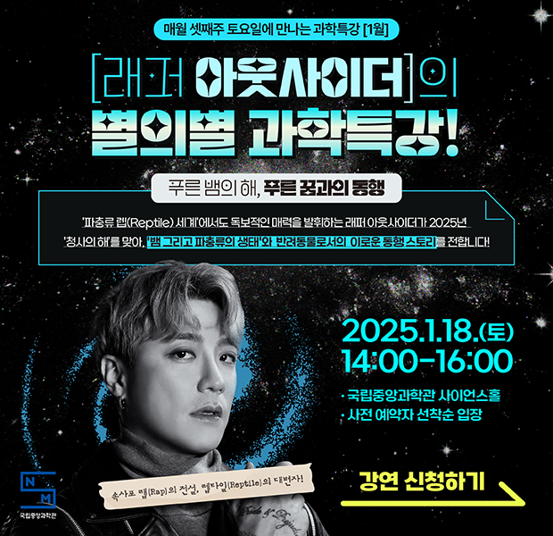 2025년 1월 첫 강연에서는 푸른 뱀의 해를 맞이하여, 우리나라 연예계 대표 파충류 애호가이자 속사포 랩의 대명사인 래퍼 아웃사이더를 초청하여 뱀과 파충류의 생태 그리고 반려동물로서의 이로운 동행 이야기까지 들어보는 시간을 가지고자 합니다.