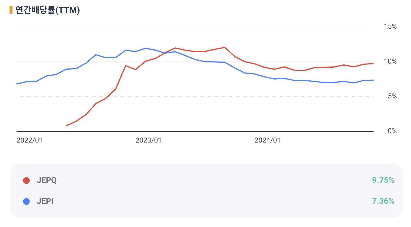 | JEPQ | JPMorgan Nasdaq Equity Premium Income ETF | 나스닥 100 지수에 투자하면서 높은 배당 수익률을 제공하는 ETF | 연간 0.35% | 22년 5월 3일 | 9.75% |
